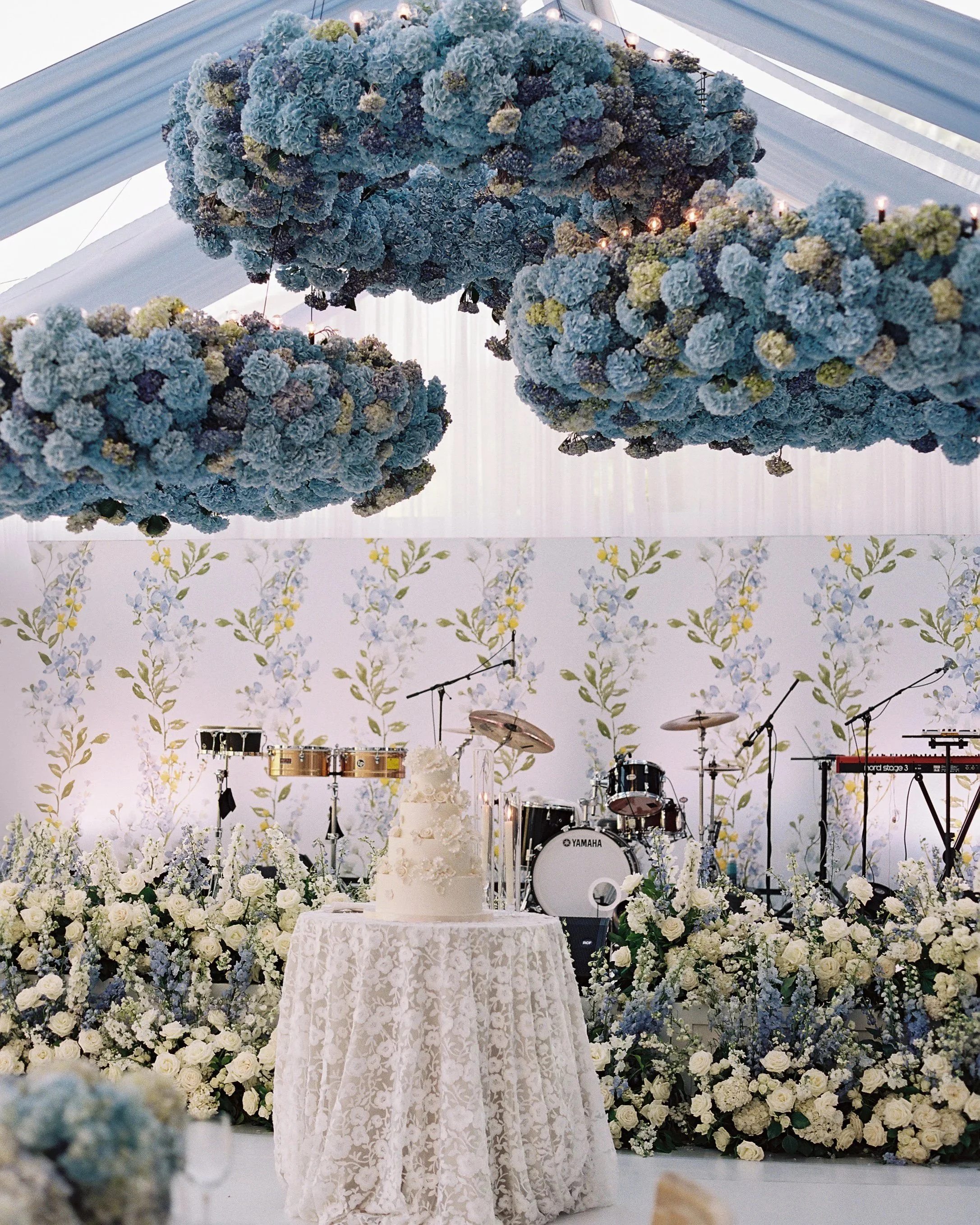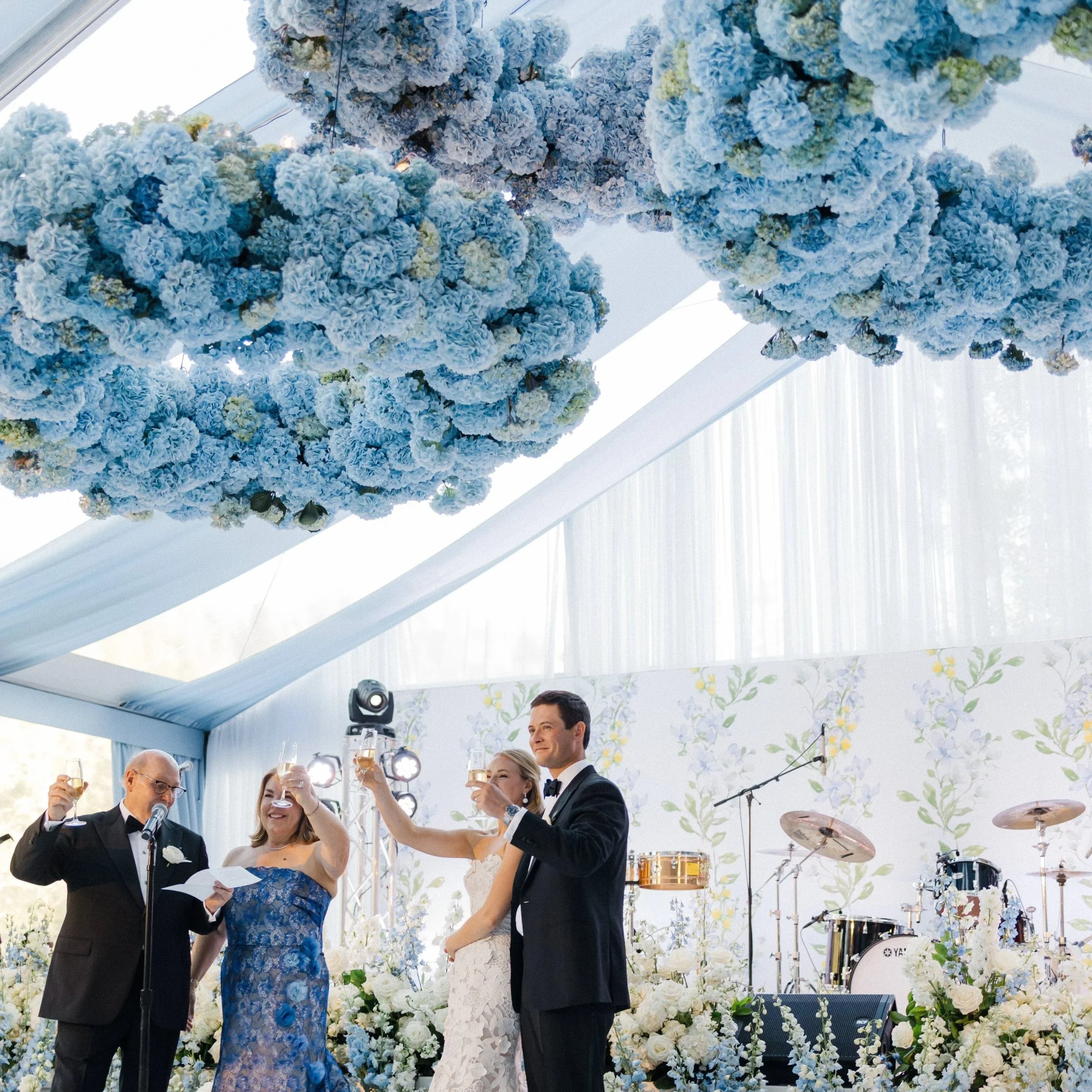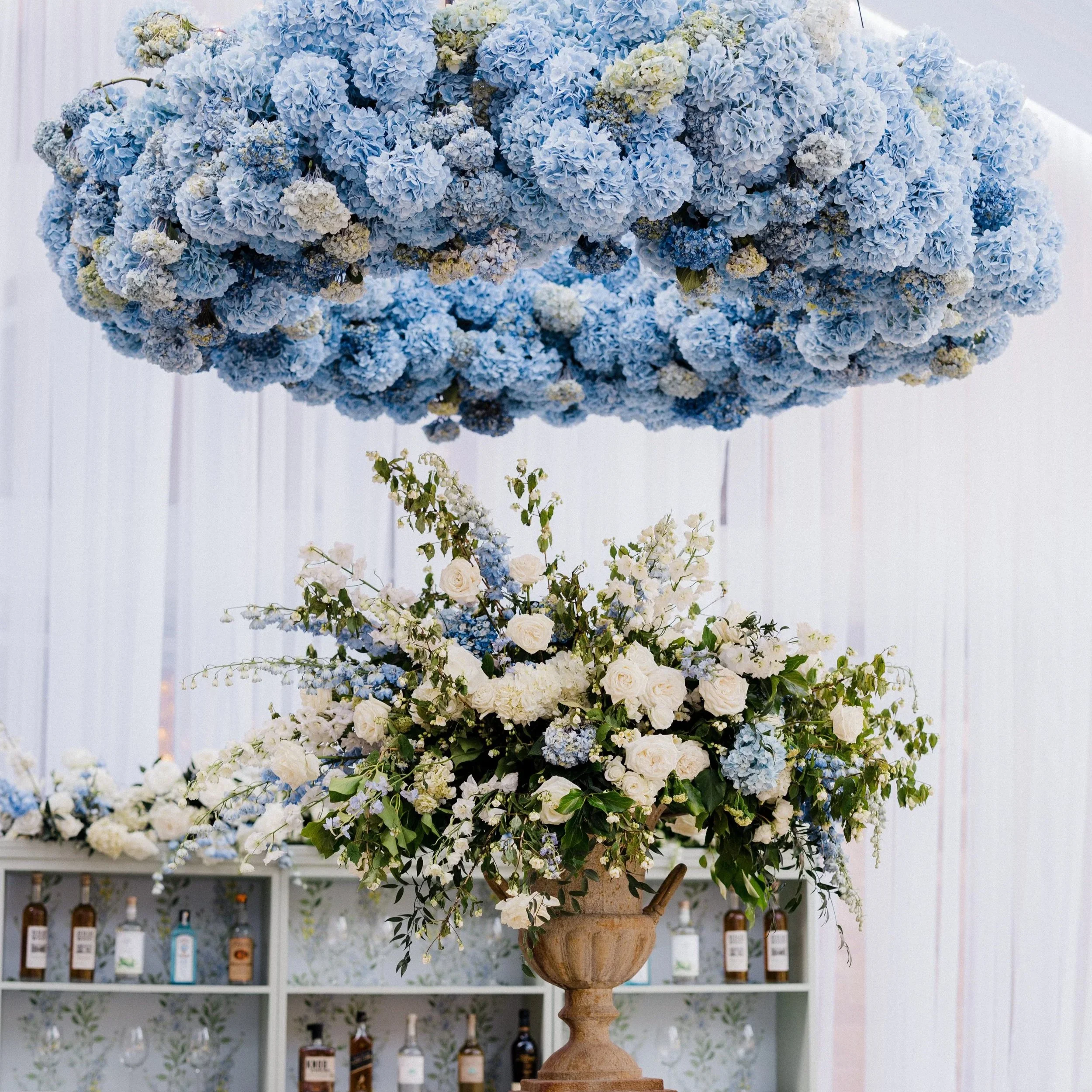 The ceremony featured a breathtaking 15-foot cathedral arch, enveloping the couple in soft, cloud-like florals that framed the moment with quiet grandeur. Inside the reception space, four massive fresh floral chandeliers floated overhead, transforming the room into a romantic dreamscape. From the first installation to the final stem placed, this Cape Cod–inspired celebration was a true labor of love—and a floral dream brought beautifully to life.