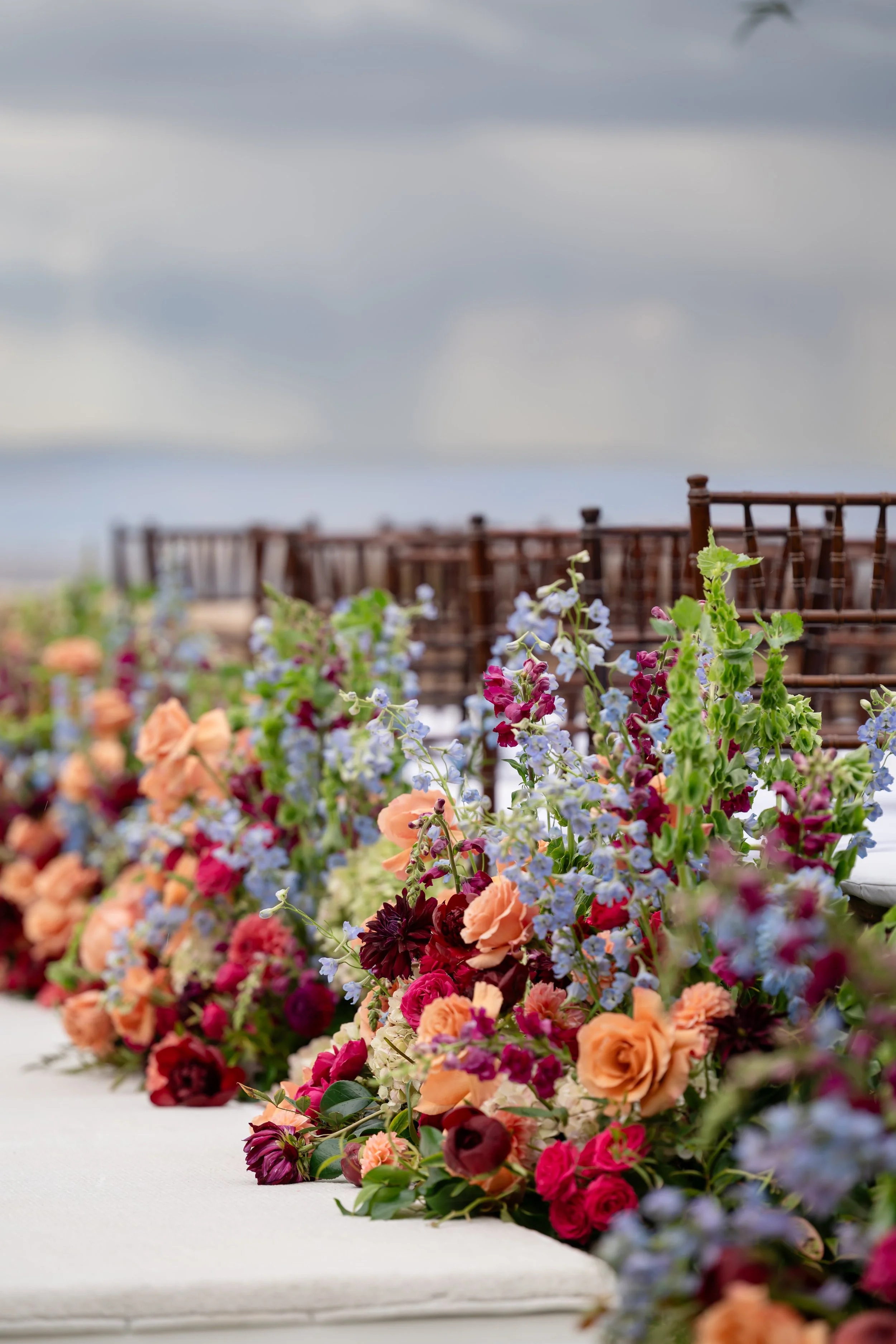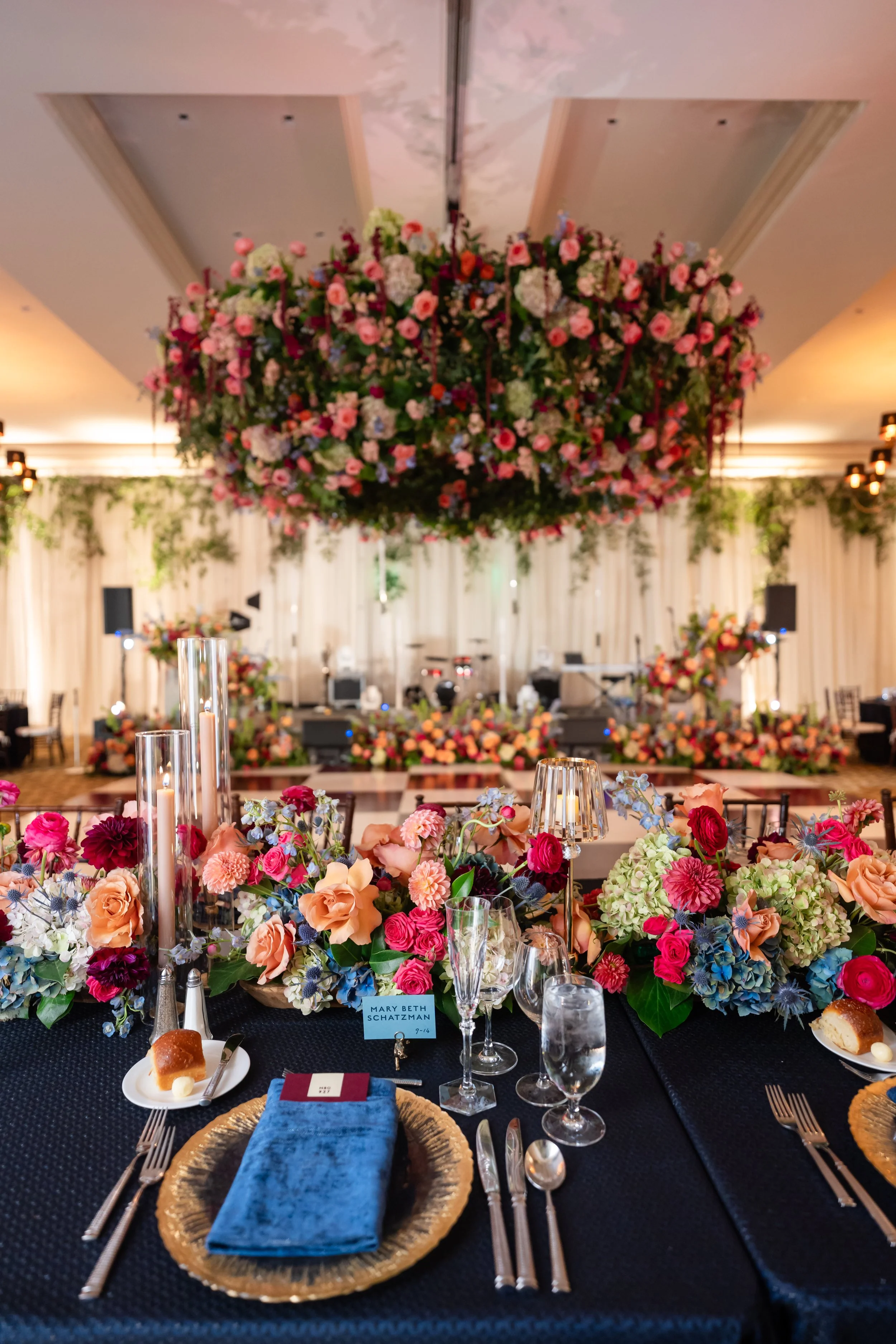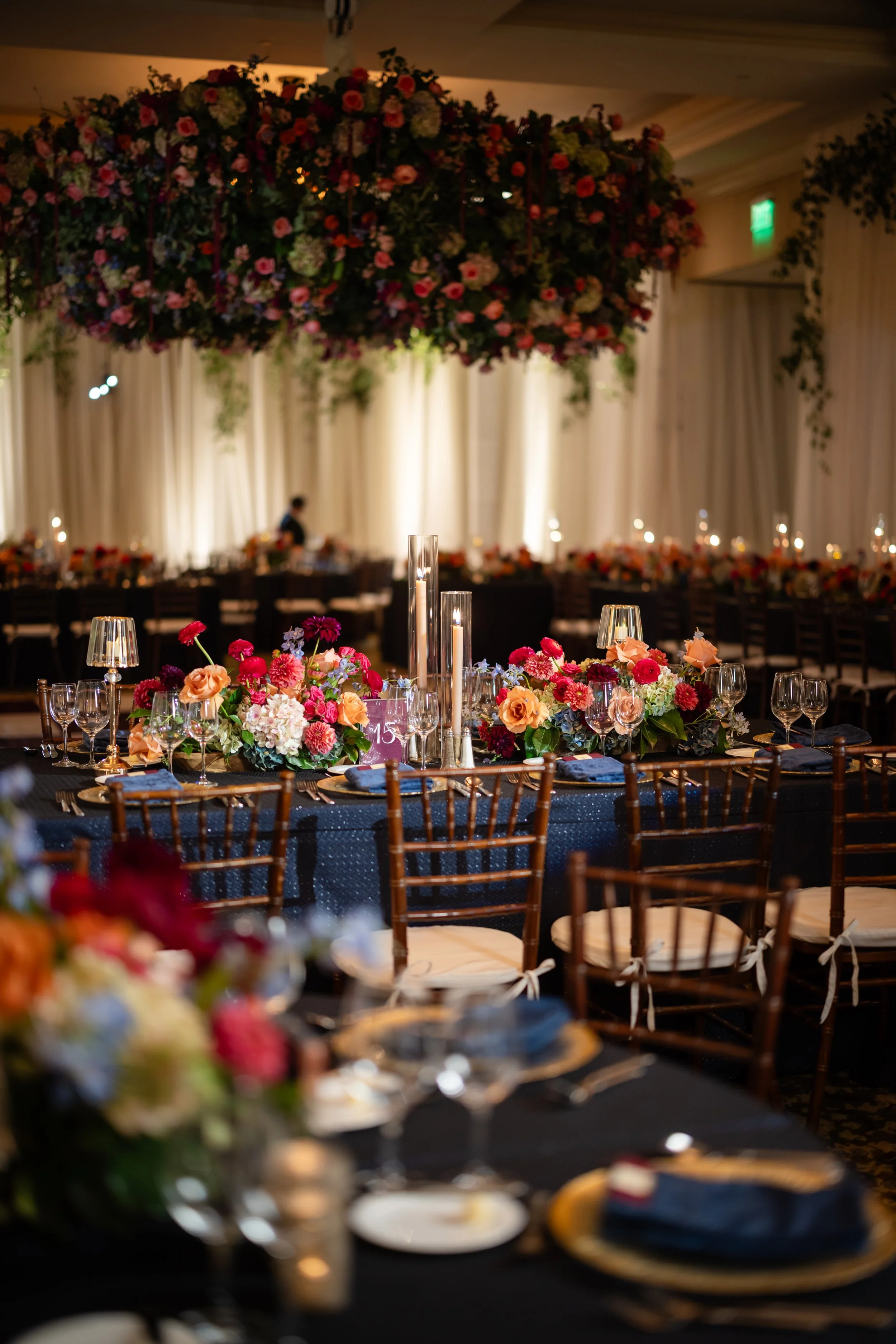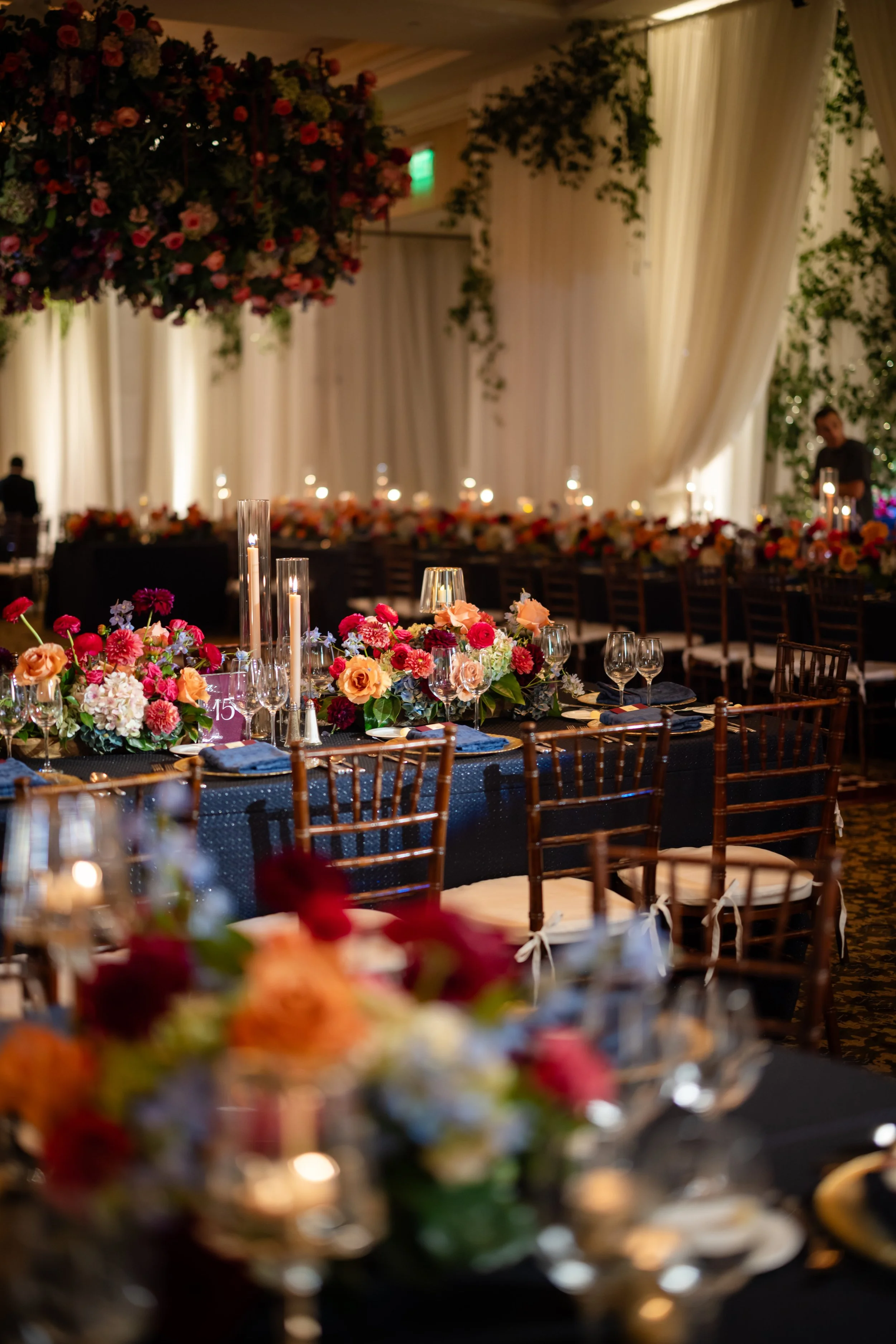 This unforgettable September celebration was a masterclass in balance — where softness met bold intention at every turn. A thoughtfully layered color palette set the tone, weaving delicate, romantic hues with striking, statement-making moments. Overhead, a custom double-tiered chandelier anchored the design, casting a warm glow across the space and elevating the entire atmosphere.