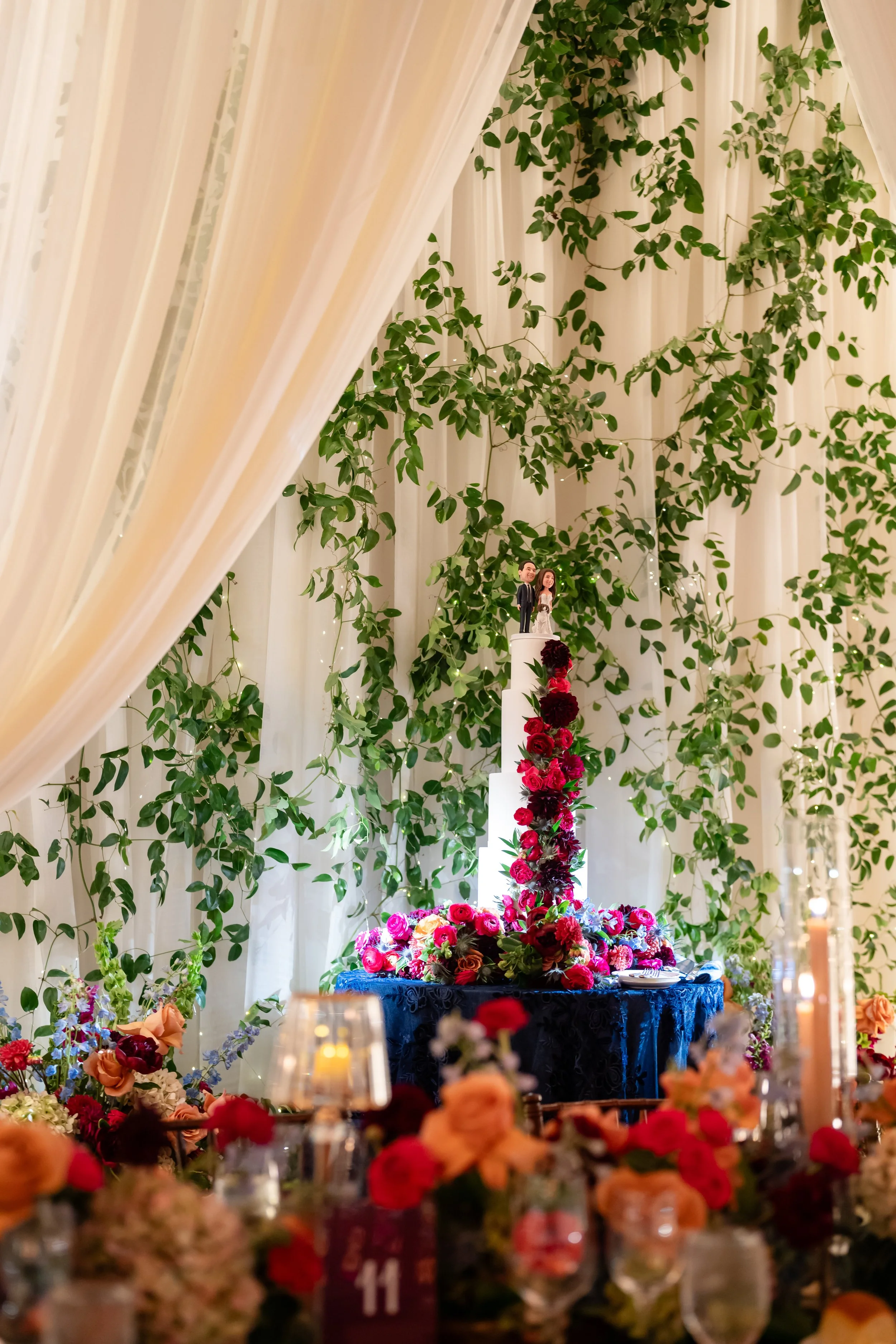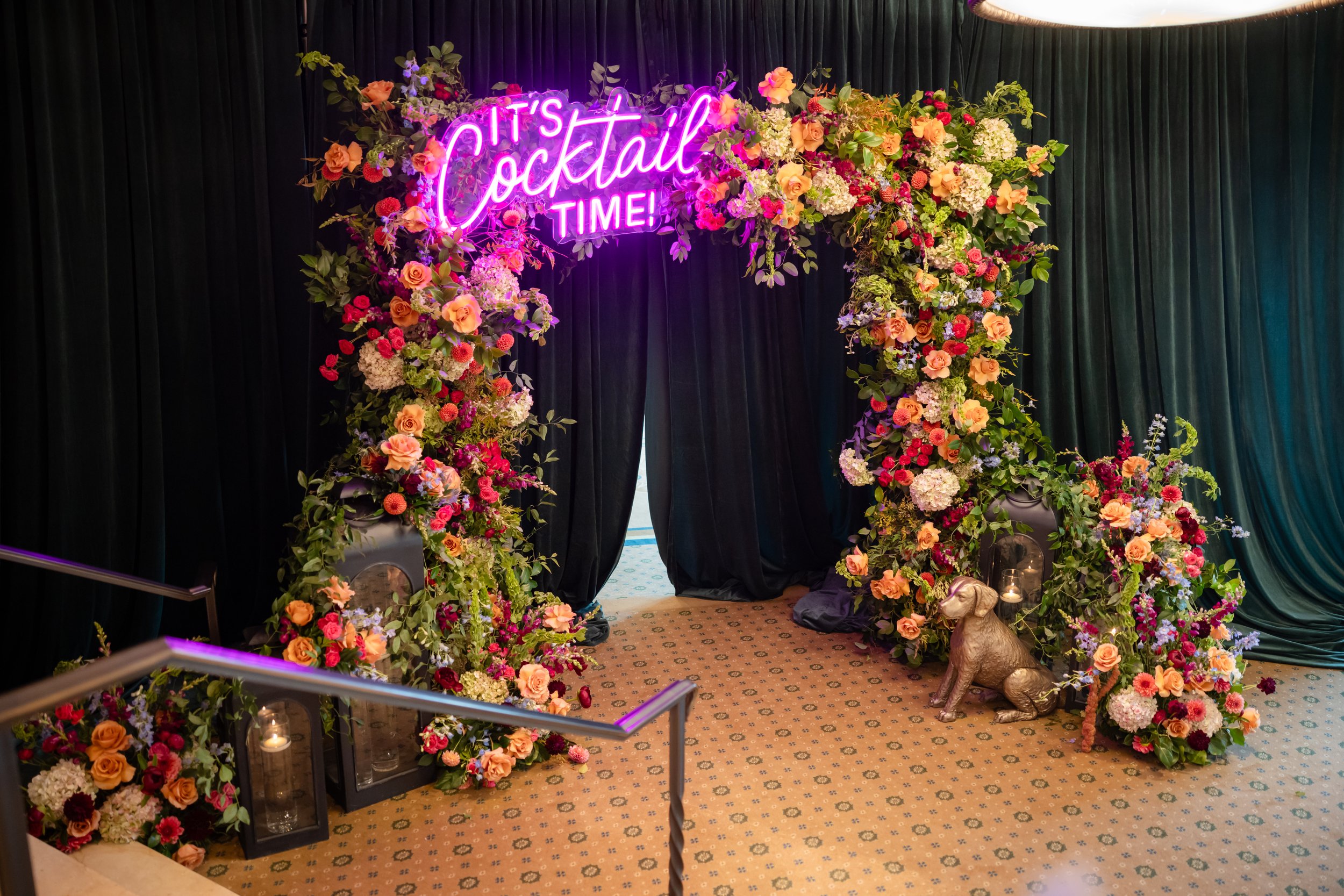 Guests were welcomed into cocktail hour beneath an oversized floral arch that felt both grand and inviting — a perfect prelude to the celebration ahead. Inside the reception, a showstopping cake stood proudly within its own lush greenery cloche, transforming dessert into a true design moment. Every detail was curated with purpose, blending refinement and drama in a way that felt effortless.